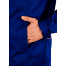Высокое содержание хлопка гарантирует превосходную гигроскопичность: ткань мгновенно впитывает и отводит лишнюю влагу, обеспечивая естественное охлаждение кожи. Это критически важно при длительной работе на открытом солнце в Ленинградской области. Применение технологии механического стретча придает материалу необходимую эластичность без потери прочности. Куртка устойчива к разрывам и истиранию, а кубовое крашение обеспечивает стабильность синего цвета — изделие не выгорает и не линяет даже после многочисленных циклов промышленной стирки. Дополнительная отделка МВО (масловодоотталкивающая) защищает волокна от глубокого проникновения производственных загрязнений, упрощая процесс ухода за вещью.