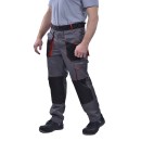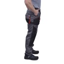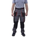 Брюки мужские с застежкой гульфика на тесьму «молния» и притачным поясом с красными шлевками. Передние половинки брюк с 2 боковыми накладными карманами с наклонным входом. На левой половинке в области колена дополнительный карман.