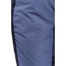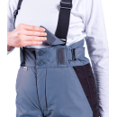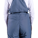 Брюки оснащены высоким утепленным поясом на двух пуговицах, который надежно защищает поясничную зону. С помощью боковых хлястиков на липучках и двухщелевых пряжек объем пояса можно точно отрегулировать по талии. Уникальная особенность модели — съемная спинка с уютной подкладкой из флиса. Она пристегивается к поясу на пуговицы, превращая брюки в высокий полукомбинезон. Эластичные бретели с надежными фастексами позволяют быстро настроить высоту посадки под любой рост.